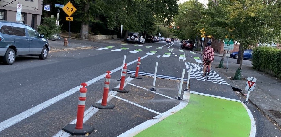 While riders have a largely low-stress, comfortable ride separated from moving cars by parked cars, that protection falls away at the bus stop where they need to mix with large vehicles that have somewhat limited rear and side visibility.