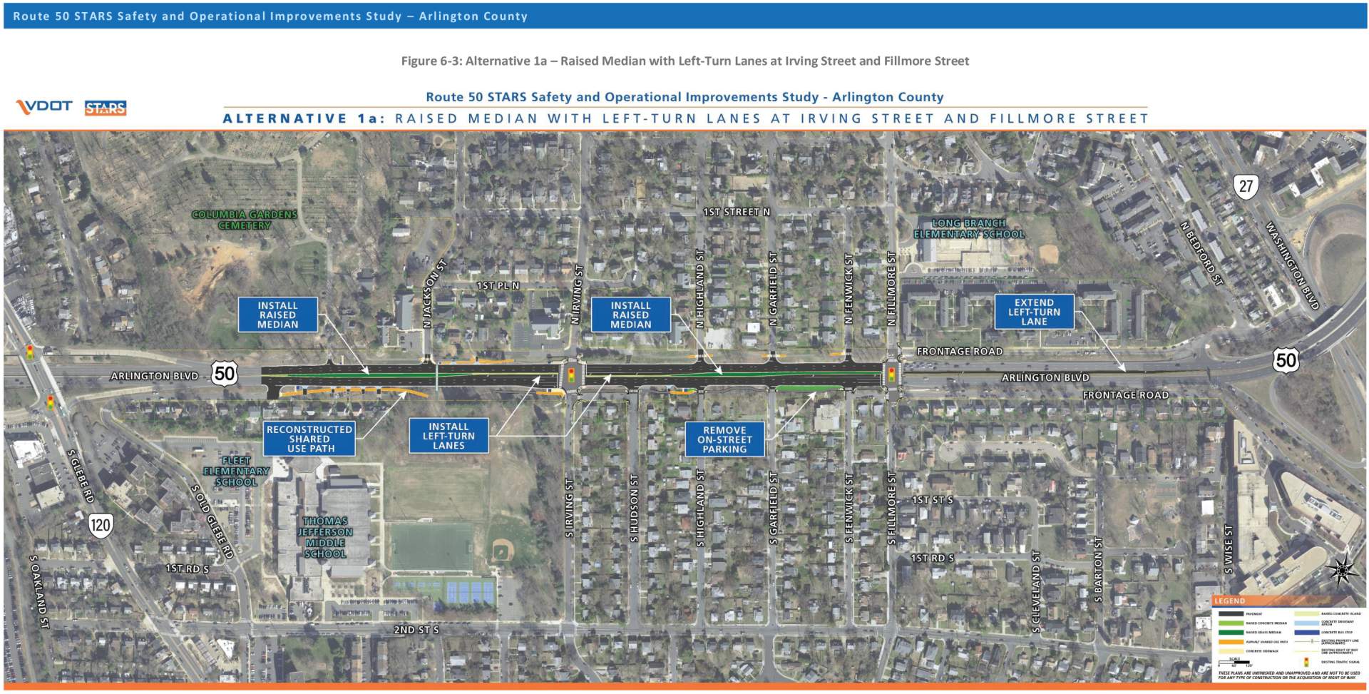 VDOT’s preferred alternative consists of a wide median from Glebe Road to Fillmore Street, the creation of dedicated left turn lanes at Irving Street, the extension of the westbound left-turn lane at Fillmore Street and the addition of dedicated left-turn phasing (green arrows) at Irving Street to service those new dedicated turn lanes.