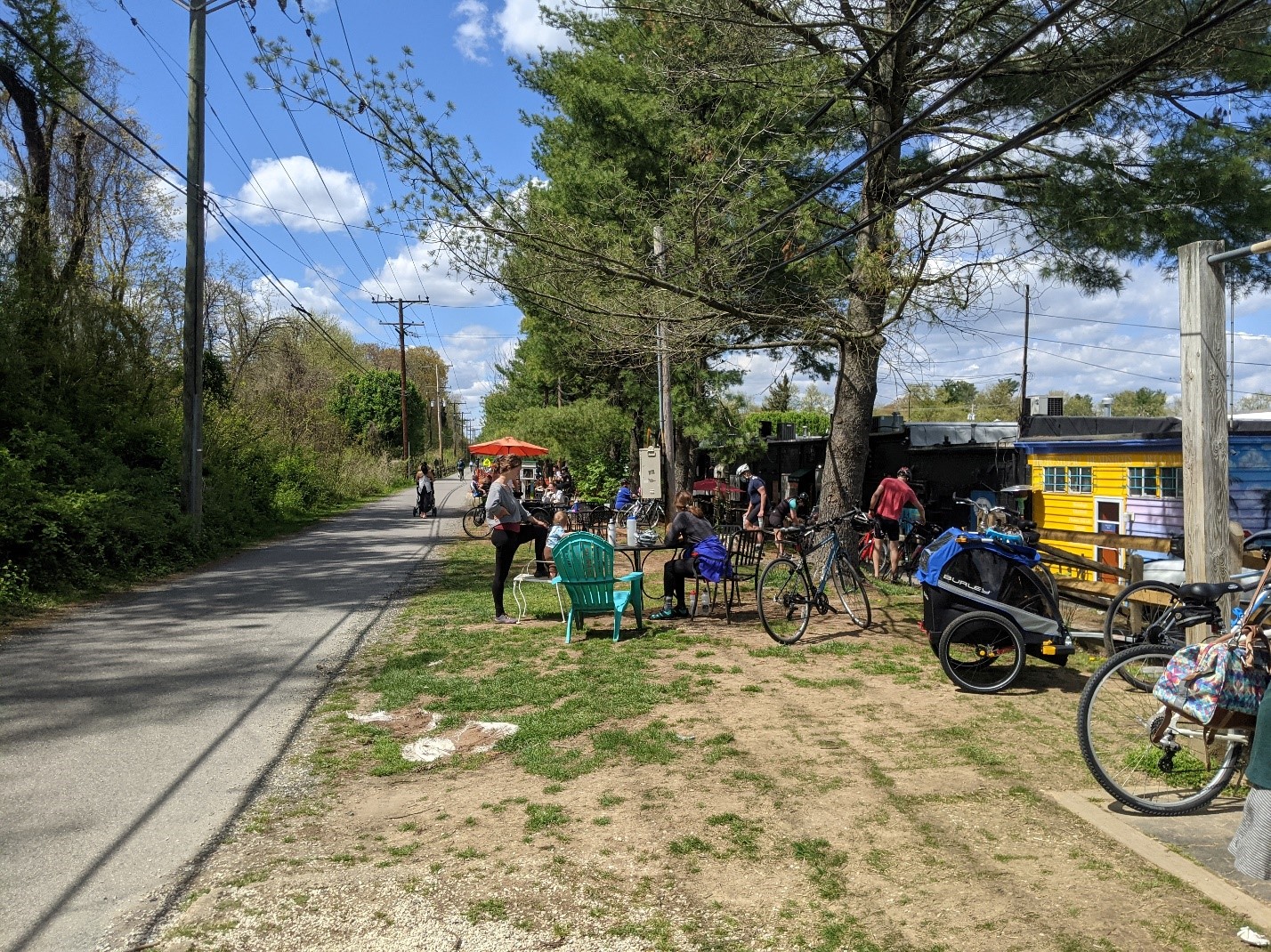 I saw an even more active and varied example of this recently on the Baltimore & Annapolis Trail. Nearly every business in this trail-adjacent strip mall had a usable back-entrance & there was a shared seating area along the trail adjacent to them. The coffee shop even had a little walk-up window where you could order from the trail side without setting foot inside the shop.
